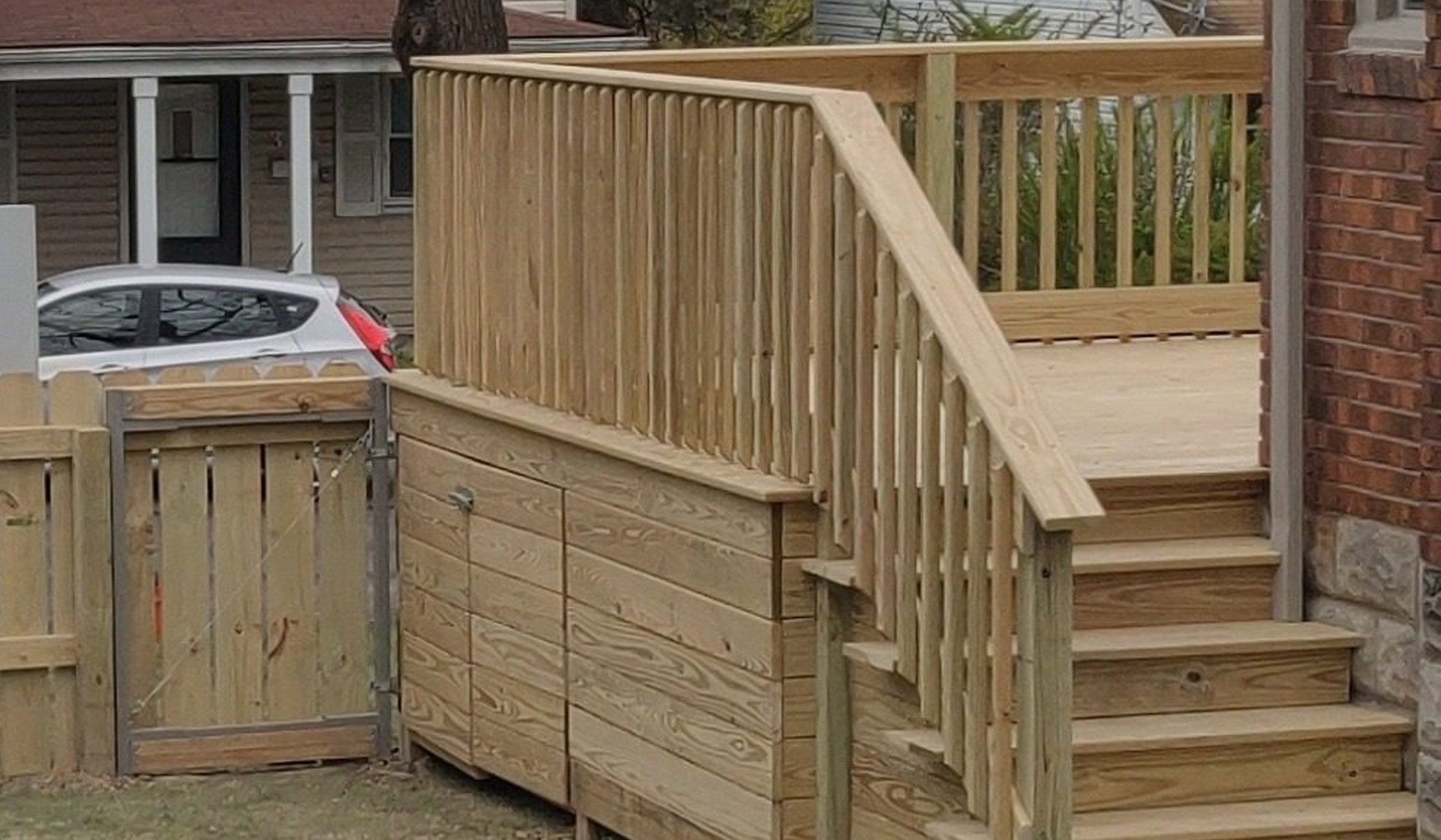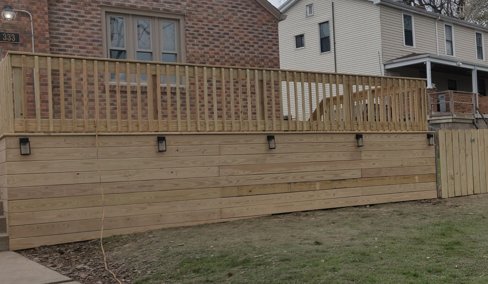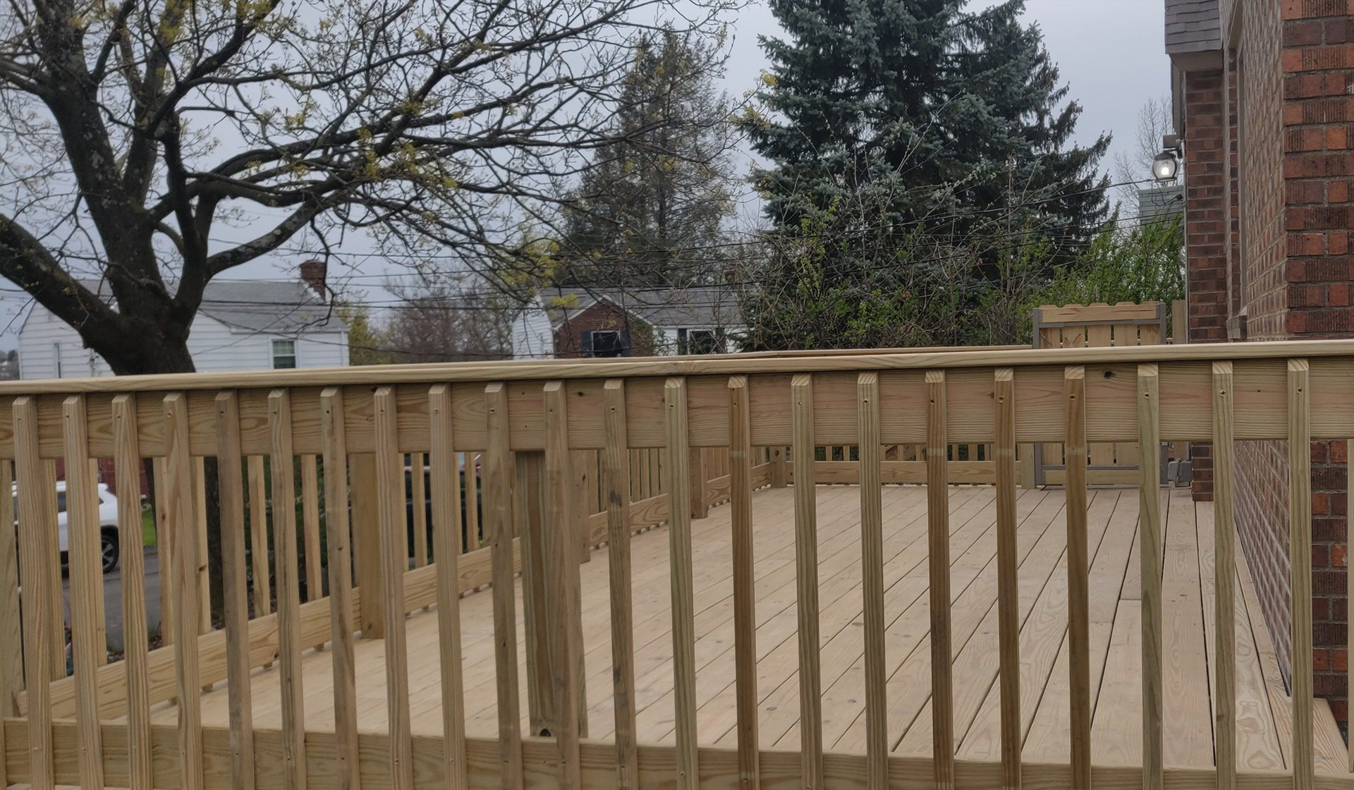 This elevated pressure-treated wood deck project in Carrick replaced an aging structure with a beautiful, safe outdoor space. Our clients needed a sturdy, code-compliant deck with classic styling that would blend with their home’s traditional architecture. We built a spacious elevated deck featuring pressure-treated lumber, vertical picket railings, custom skirting with built-in lighting, and quality construction that ensures safety and longevity for this Pittsburgh neighborhood home.