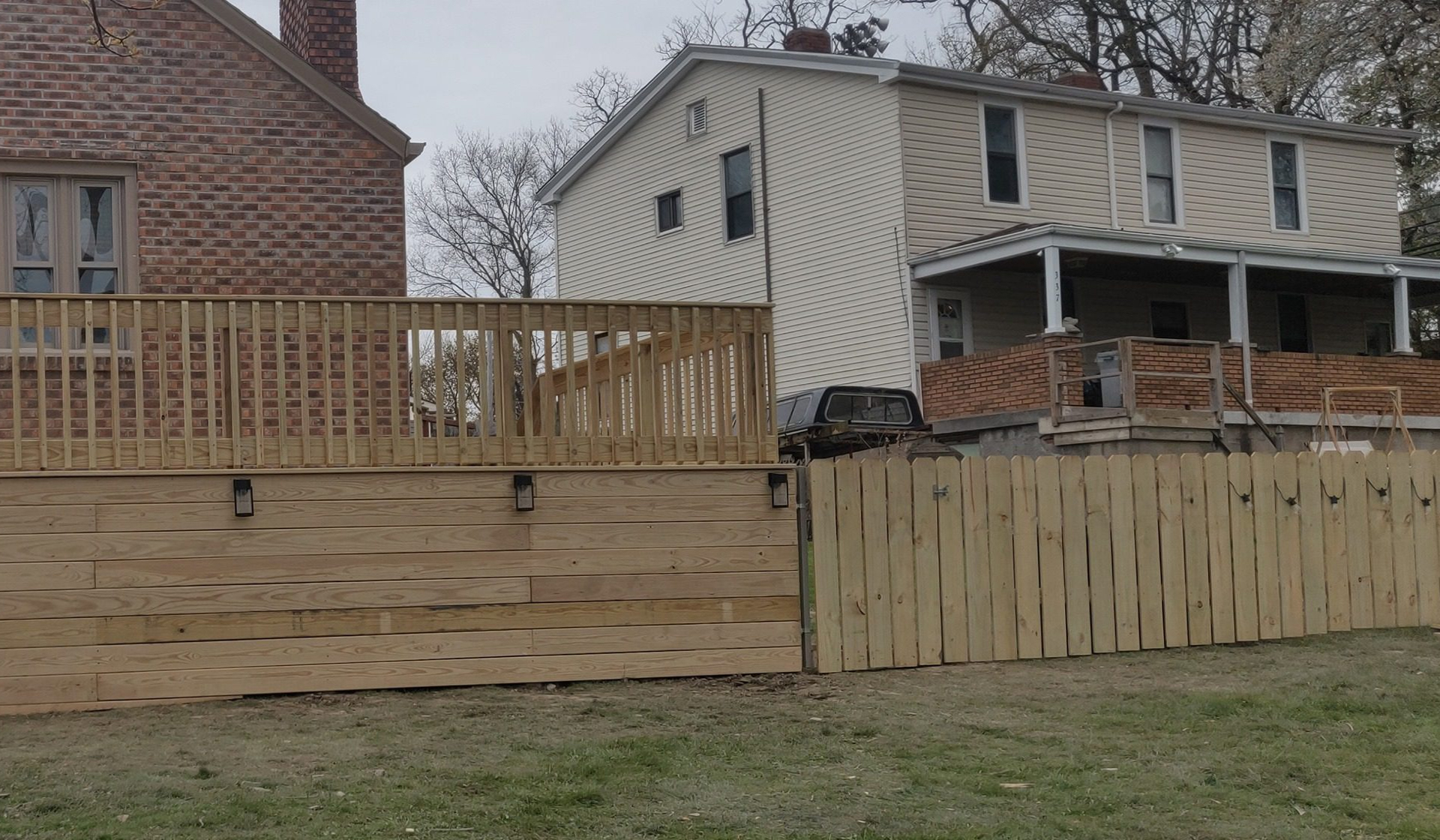 We delivered a stunning elevated deck that exceeds all safety standards while providing the outdoor space our clients envisioned. Quality pressure-treated lumber, vertical picket railings, and professional construction techniques ensure durability for years to come. The custom skirting with built-in lighting adds a finished touch while concealing the understructure. Every detail was carefully executed to create an outdoor space the family can enjoy with complete confidence.